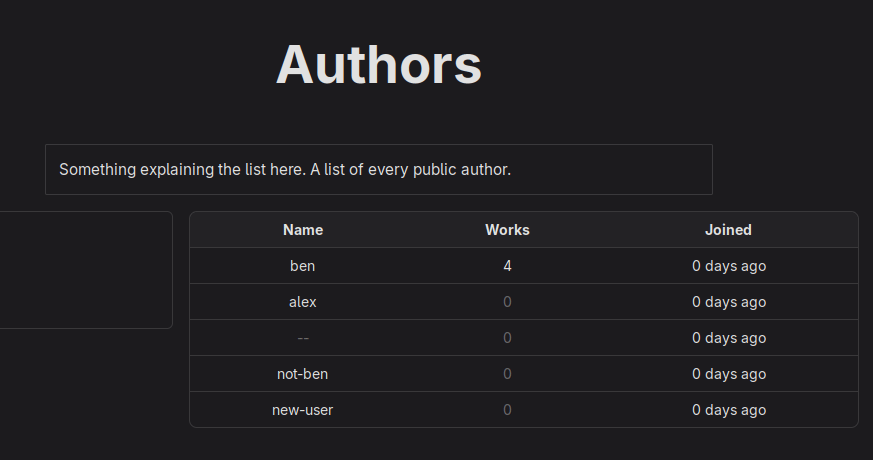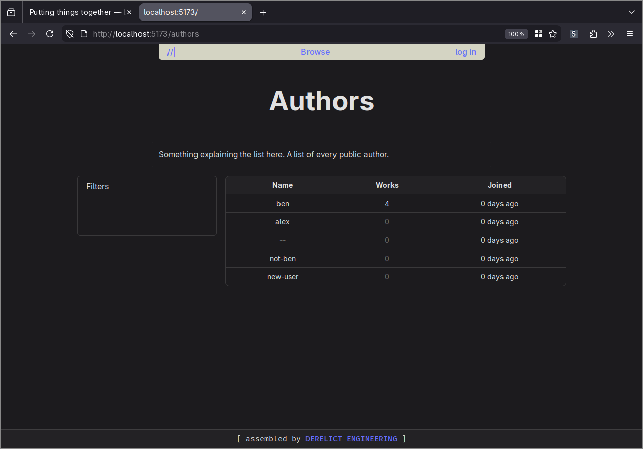The first page of the website that I’ve been building has been the ‘Browse Authors’ page, which shows a list of every person who can publish works to the library. It’s a decent learn-how-to-do-things page because it loads and renders data from the back-end API and allows me to play around with making components (such as the data table).