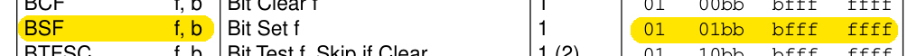 ( Sets bit b of register f. ) %BSF:f:b #01_01bb_bfff_ffff; ( Using the instruction to set bit 3 of register 0x05. ) BSF:0x05:3