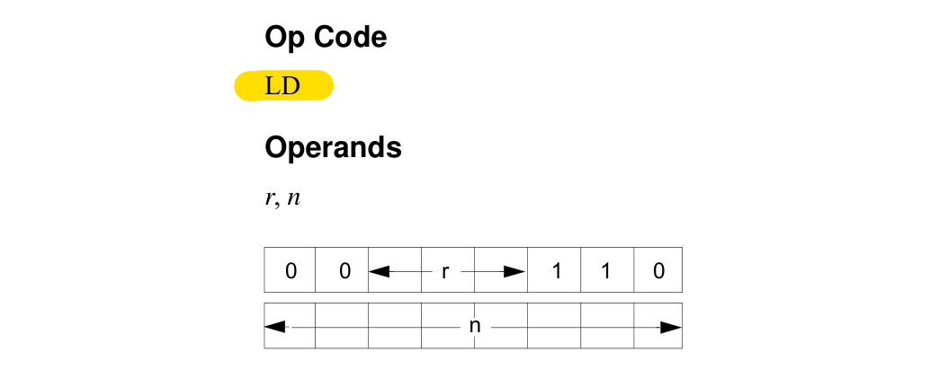 This instruction is two bytes long, with the first byte containing the op-code and the register to write the value to, and the second byte containing the value itself. The possible values of the r bit field are listed in the table further down the page, with each value mapping to one of the seven general-purpose registers: