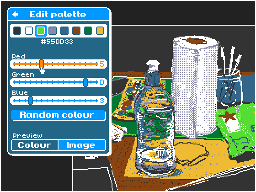 Images created with Cobalt can contain up to eight user-selectable colours, with a maximum image size of around 400x320 pixels (determined by area).