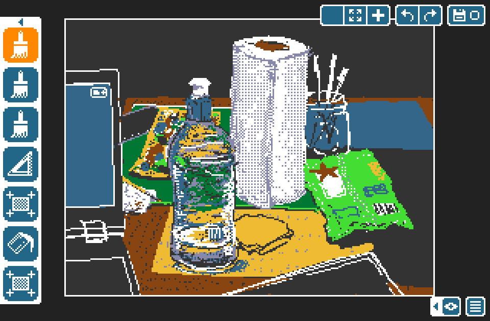 The middle group of buttons along the top edge of the screen is used to revert changes to the canvas. This will only revert draw operations, not changes to the palette, shapes, patterns, or tool settings.