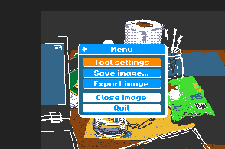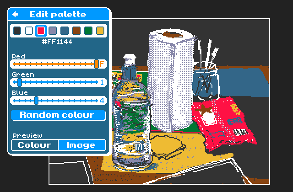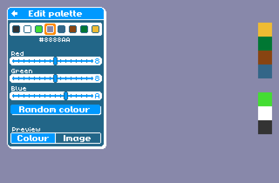 Each image has a colour palette containing up to eight different colours. Clicking on the current brush colour on the tool settings screen will open the edit palette screen, allowing you to change the colours in the palette. When a colour is changed, all pixels of that colour in the image are changed to the new colour.