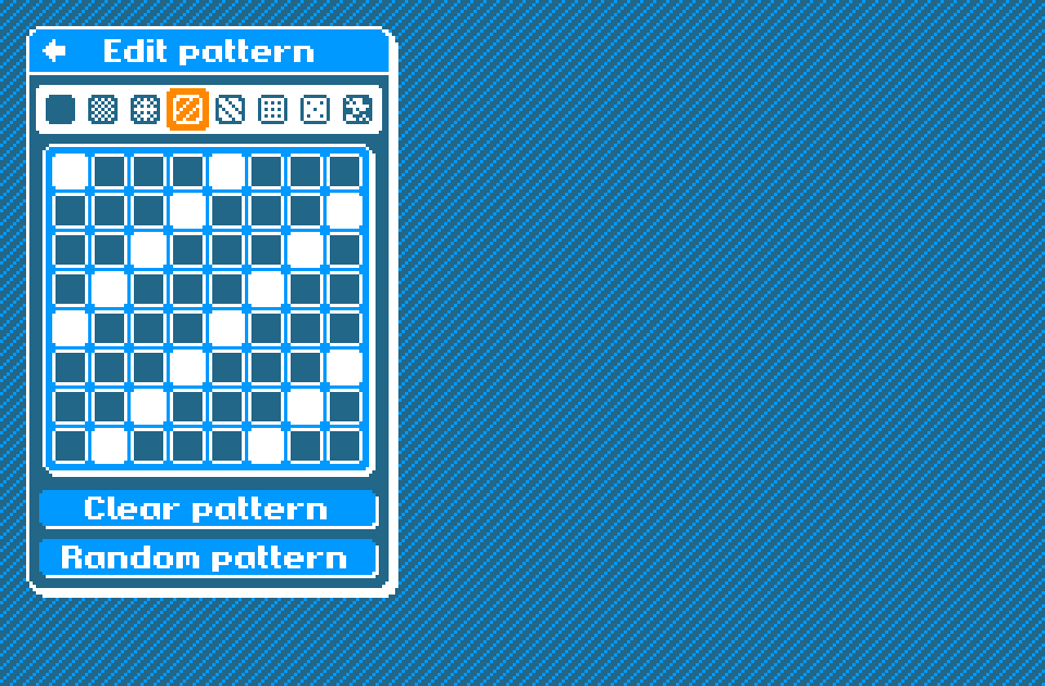 The ‘Clear pattern’ button will toggle off every pixel in the pattern. The ‘Random pattern’ button will randomise each pixel in the pattern, with a 50/50 chance of each pixel being set on or off.