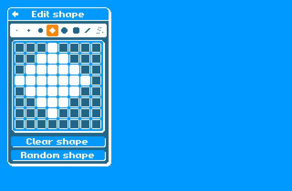 The ‘Clear shape’ button will toggle off every pixel in the shape. The ‘Random shape’ button will randomise each pixel in the shape, with a 25/75 chance of each pixel being set on or off (the final row and column will always be kept blank).
