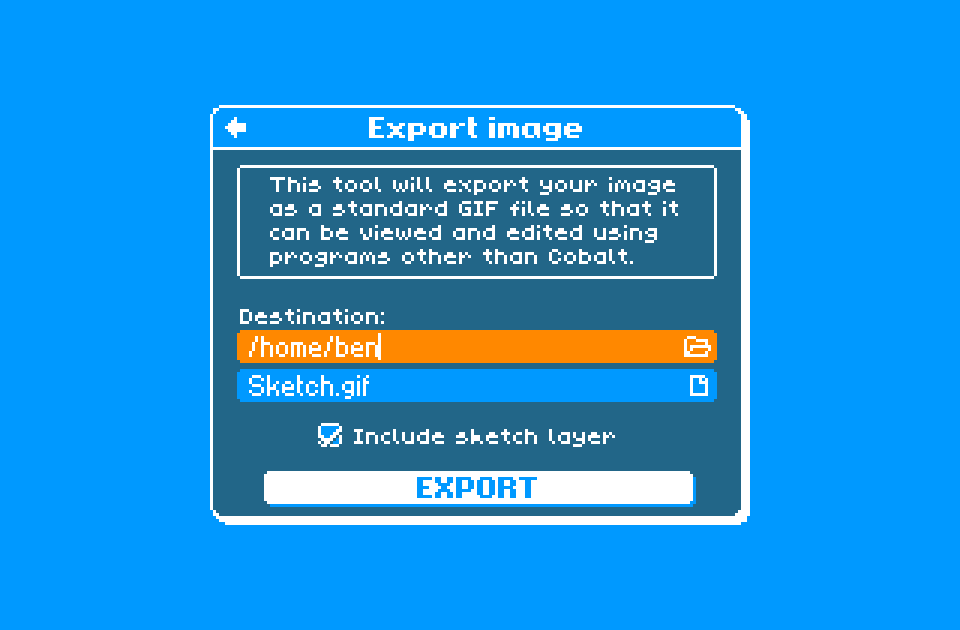 Cobalt is a painting program for creating textural and expressive pixel art. It’s small, fast, and easy to use, but still has all of the features you need for creating bold and evocative images.