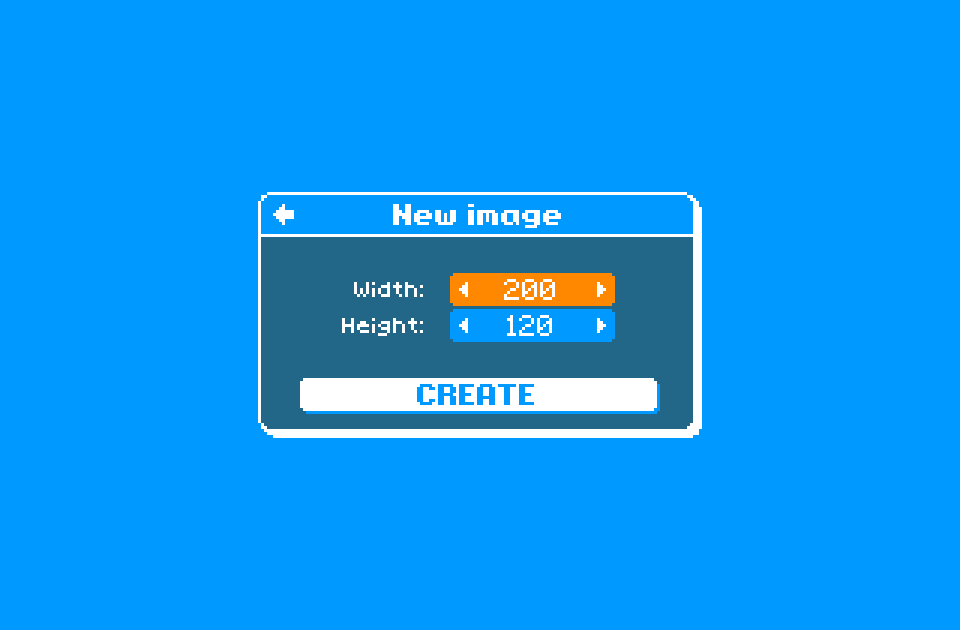 To create a new image, click the ‘New image’ button from the splash screen. This will take you to the new image screen, where you can choose how large you want your image to be (in pixels). The size cannot be changed once the image has been created.