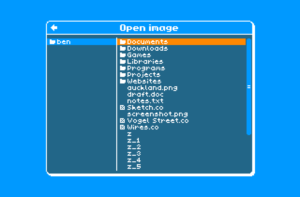 The right-hand panel of the file browser shows the contents of the current folder, and the left-hand panel shows the contents of the the parent folder. The icon to the left of each entry indicates whether it’s a folder (has a folder icon), a Cobalt image file (has a textured square icon), or an ordinary file (has no icon). Only image files created by Cobalt will be able to be opened in Cobalt.