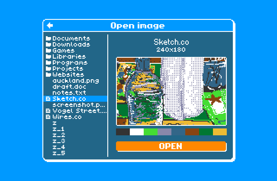 When clicking on a file, a preview will show the image dimensions, the colour palette used, and a preview of the image itself. If the image is larger than the viewport, dragging on the image will move it around inside the viewport. Clicking the ‘Open’ button will open that image, taking you to the canvas screen.