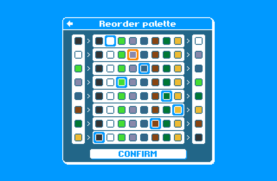 The left-hand column represents the current order of the colour palette, the eight selectors in the middle of the window are used to remap the colours, and the right-hand column represents the new colour palette. Each colour in the current palette must be represented exactly once in the new palette.