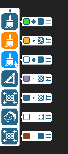 The large icon indicates the tool mode, and the items in each bubble from left to right indicate the colour, shape, pattern, and spacing and scatter (top and bottom slider, respectively) of that tool.