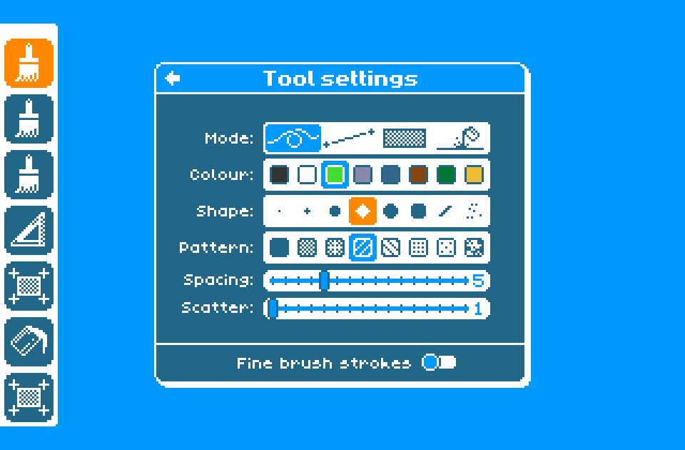 The vertical panel extending from the left edge of the screen is called the tool palette, and is used to select a drawing tool. You can switch between tools by clicking on a new tool, by pressing numbers 1 through 7 on the keyboard, or by pressing the up and down arrow keys. Clicking on the selected tool will open the tool settings screen, and clicking on the small arrow at the top will hide the panel.